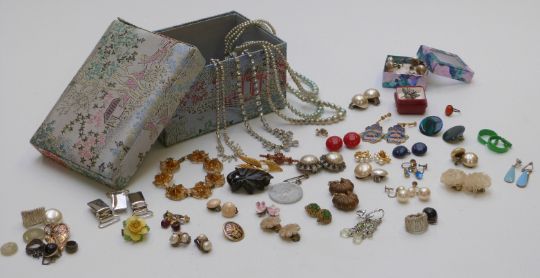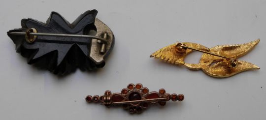 A collection of costume jewellery including jet brooch, silver brooch, diamanté necklaces etc