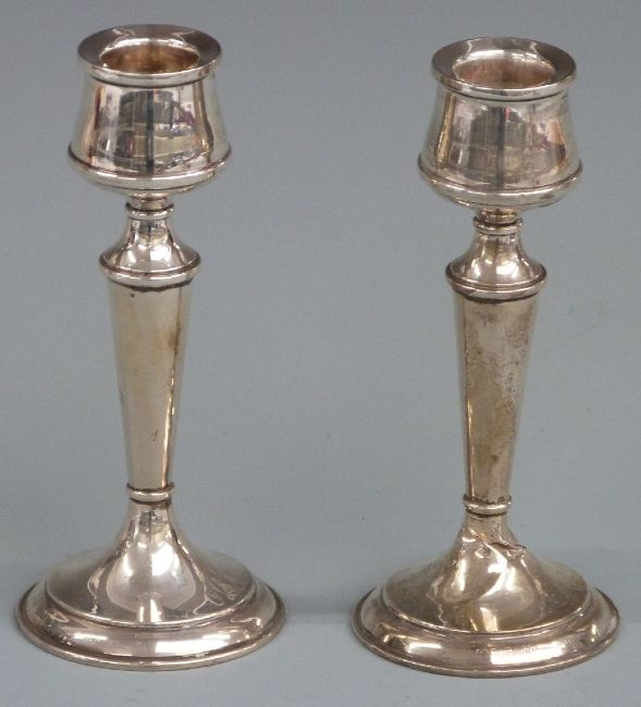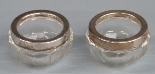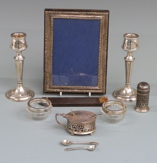 Hallmarked silver photograph frame to suit 6 x 4 inch photo, pair of hallmarked silver candlesticks, height 13cm, hallmarked silver pepper and mustard with blue glass liners, pair of hallmarked silver mounted cut glass salts and three various small spoons