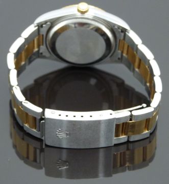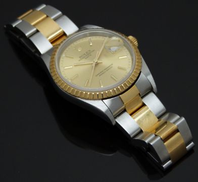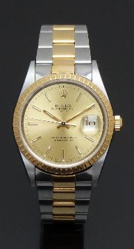 Rolex Oyster Perpetual Date gentleman's automatic wristwatch ref. 15223 with date aperture, gold hands and baton markers, champagne dial, gold bezel, stainless steel case and signed calibre 3135 movement, on bi-metal bracelet, case diameter 34mm, serial number 78353 in original box with outer card box, bezel cover, charms and related paperwork