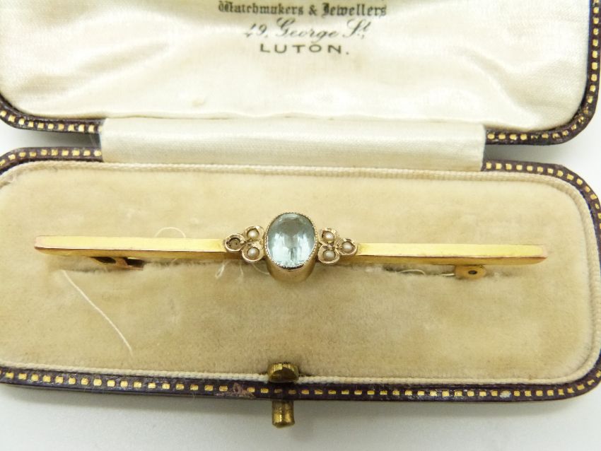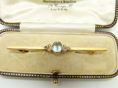 A 9ct gold brooch set with a faux aquamarine and seed pearls, in original box