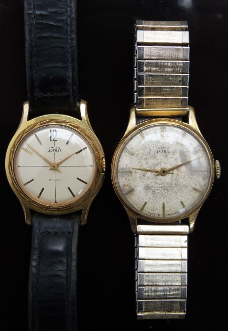 Two Smiths Astral gentleman's wristwatches each with gold hands and baton markers, silver dials and gold plated cases, one on black leather strap, the other on expanding bracelet, case diameters 32mm.