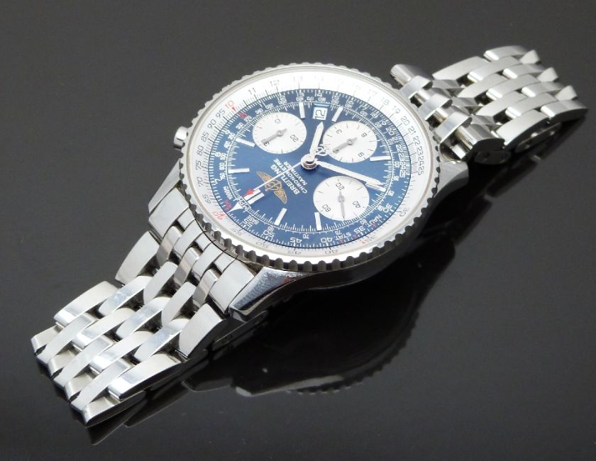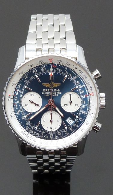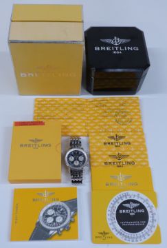 Breitling Navitimer gentleman's automatic chronograph wristwatch ref. A23322 with date aperture, blue dial, silver subdials, luminous hands and hour markers, tachymeter bezel, stainless steel case and calibre 23 ETA Valjoux 7753 movement, case diameter 42mm, serial number 818871, in original box with international warranty, original purchase receipt, paperwork and outer box.