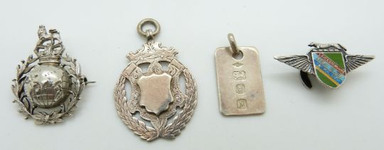 A silver Albert fob chain, silver ingot, fob, Leicestershire Aero Club and Royal Marines brooches