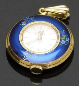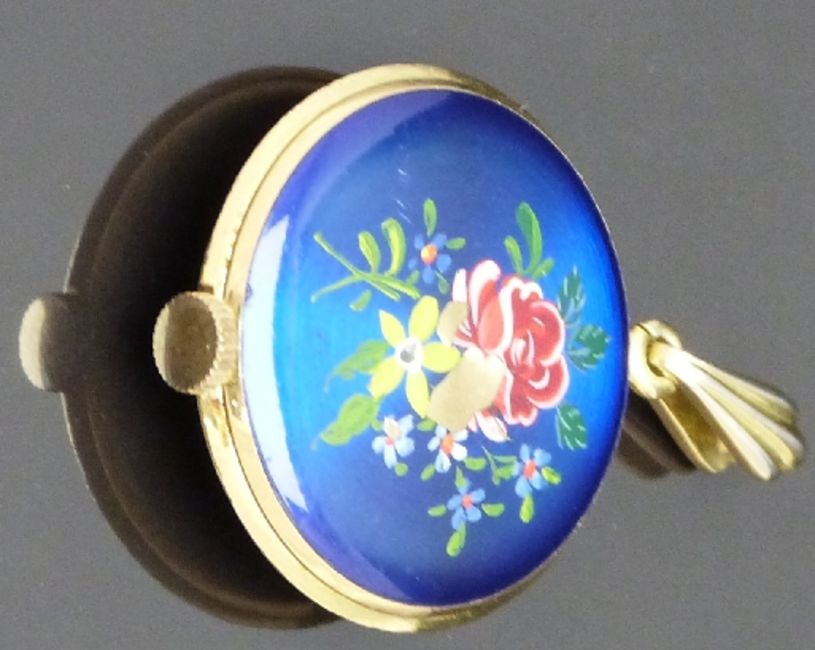 Bucherer gold plated keyless winding open faced ladies fob watch with hand painted enamel back and bezel, gold hands and baton markers, silver dial and 17 jewel movement, case diameter 29mm.
