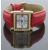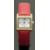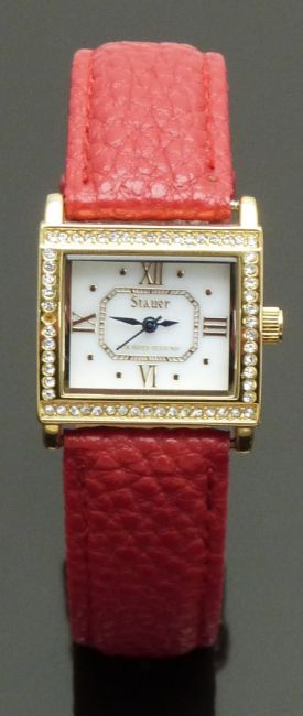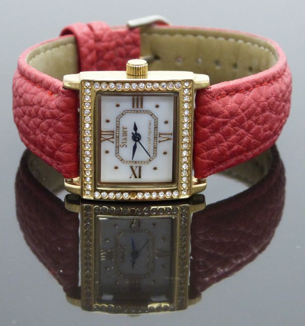 Stauer Tanque ladies wristwatch ref. 31330 with blued hands, gold Roman numerals, pearl white dial, gold plated clear stone set case and quartz movement, on red leather strap, case diameter 27mm.