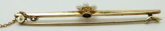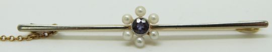 A 15ct bar brooch with platinum finish set with a sapphire surrounded by seed pearls, 5.5cm