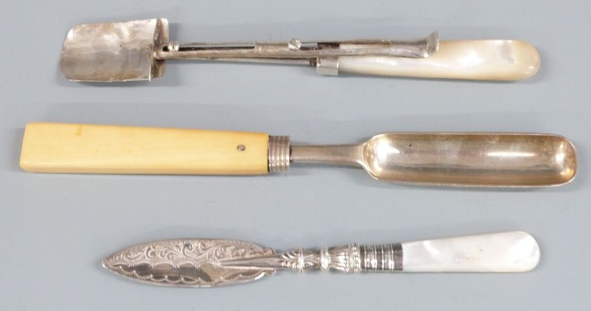 Georgian hallmarked silver marrow scoop with later handle, Edward VII hallmarked silver sugar scoop with jadeite handle, mother of pearl handled butter knife, hallmarked silver mustard spoon and a scoop, weight of all items 162g all in