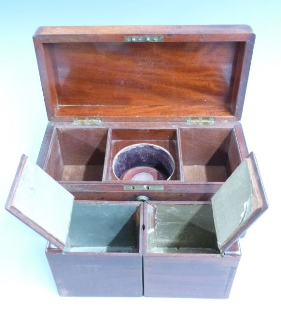 19thC mahogany tea caddy with two hinged lift out caddies, space for mixing bowl and fitted Bramah lock, W37cm