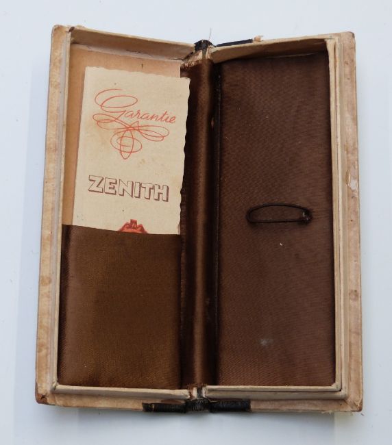 Zenith wristwatch box in the form of a book with original guarantee card together with a plaque inscribed '685 first prizes for precision at the celebrated observatories of Geneva and Neuchatel, proving the undoubted mastery of Zenith' 11cm in diameter.
