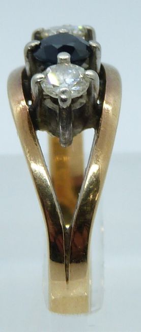 An 18ct gold ring set with a sapphire and two diamonds, 5g, size N