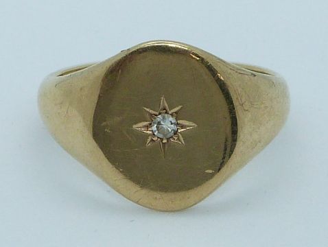 A 9ct gold signet ring set with a diamond in a star setting, 6.5g, size T