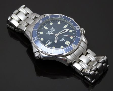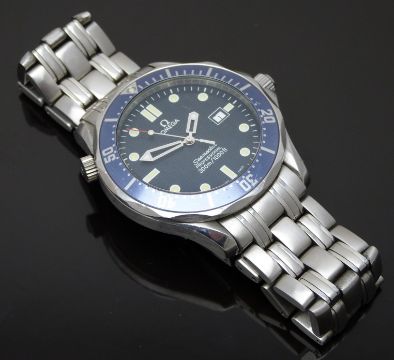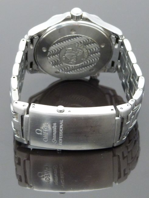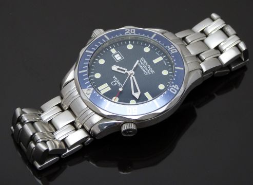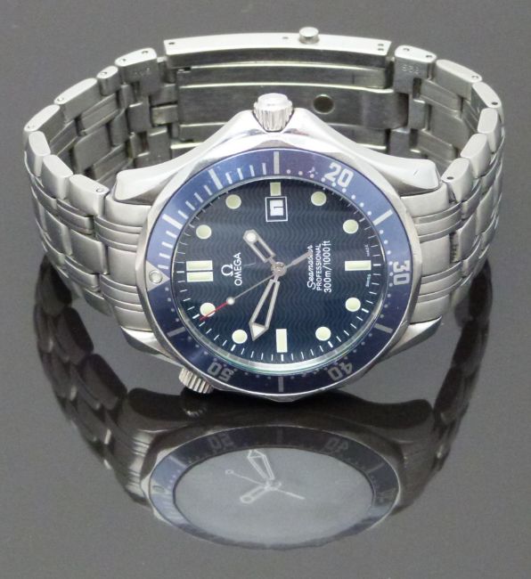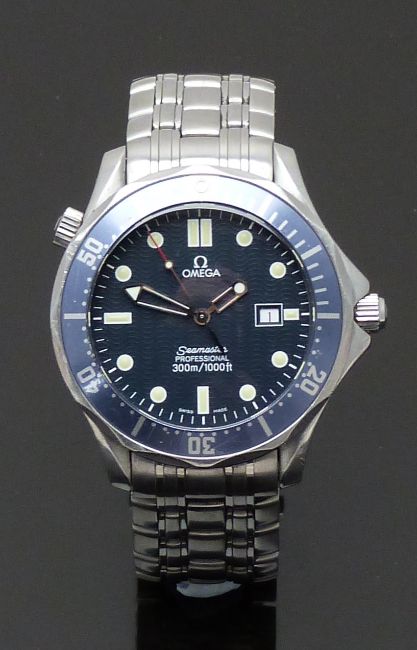 Omega Seamaster Professional 300m gentleman's diver's wristwatch ref. 196.1523 with date aperture, luminous hands and markers, blue dial and bezel, stainless steel case and signed calibre 1538 quartz movement, on stainless steel bracelet, case diameter 41mm, serial number 098FE0028, in original box