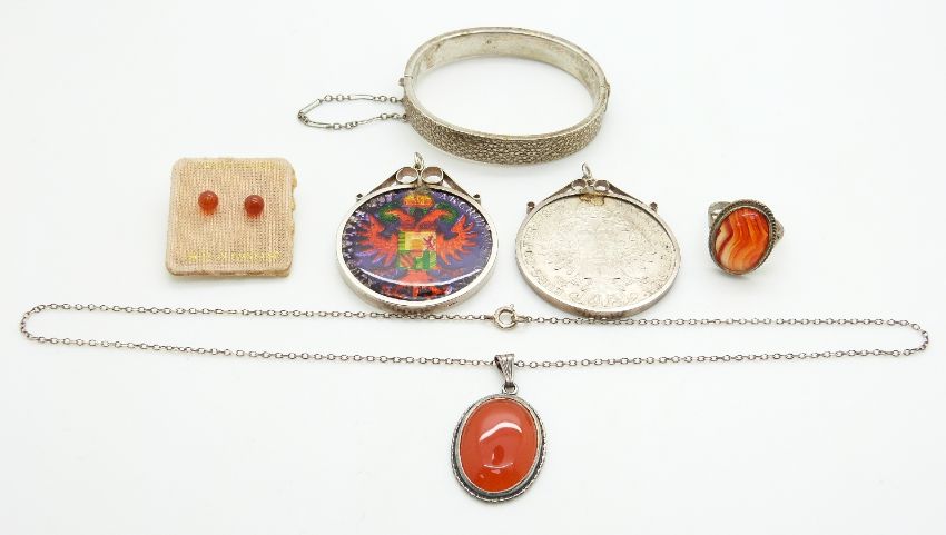 Victorian silver bangle, silver ring set with agate, agate pendant, other agate jewellery, two mounted coins and silver chain