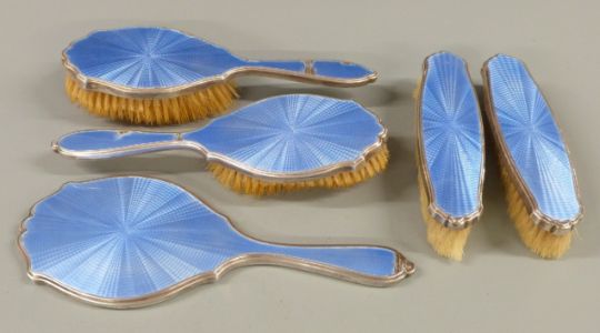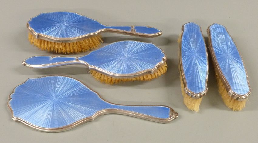 Art Deco Mappin & Webb hallmarked silver and blue guilloché enamel dressing table and manicure set comprising hand mirror, four various brushes, button hook, comb back, cut glass bottle, two further lids, further handle and cased manicure tools, all London 1930, together with a similar small compact, Birmingham 1929, diameter 4cm