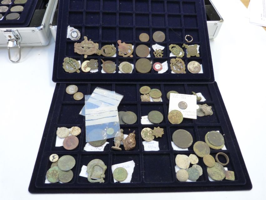 Two metal collector's cases containing metal detectorist finds, to include coins, artefacts, jewellery, badges etc, Roman times onwards, includes silver coinage, together with the diary of the detectorist