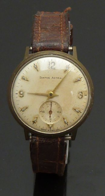 Smiths Astral gentleman's wristwatch with inset subsidiary seconds dial, gold hands and hour markers, silver dial and gold plated case, on brown leather strap, case diameter 34mm.