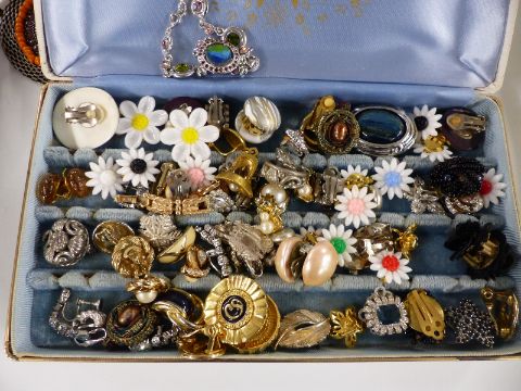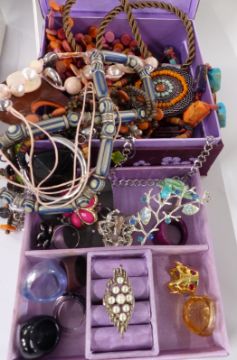 A collection of costume jewellery including necklaces, earrings, Wedgwood pendant, enamel pendant, vintage brooches, agate necklace, silver rings etc