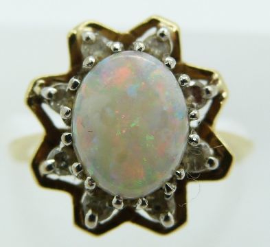 An 18ct gold ring set with an opal and diamonds, 4.3g, size I
