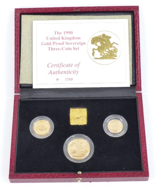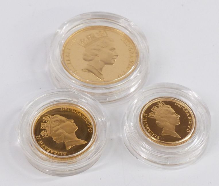 Elizabeth II 1980 United Kingdom proof gold sovereign three coin set with certificate, comprising gold double sovereign, gold full sovereign and gold half sovereign