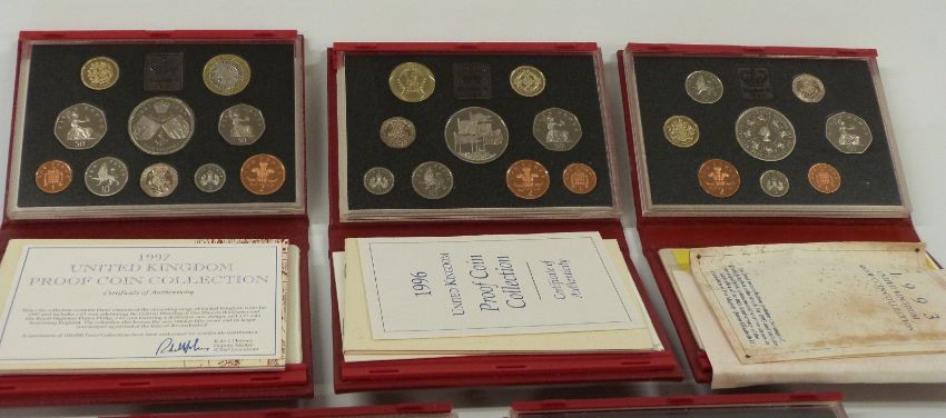 Five Royal Mint cased UK Deluxe Proof Coin sets 1993, 1996, 1997, 1998 and 1999, with certificates