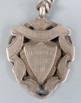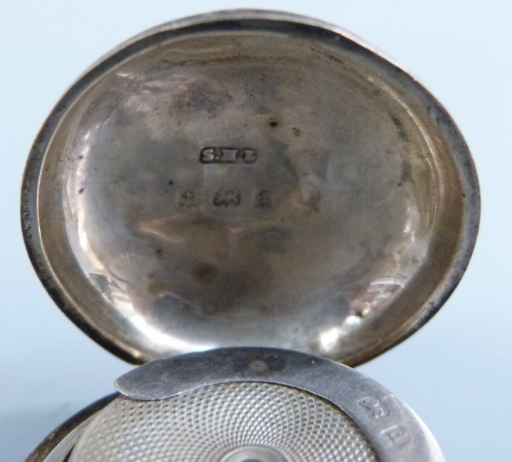 A hallmarked silver engine turned sovereign holder with hallmarked silver fob, watch key and Victorian coin on a plated Albert