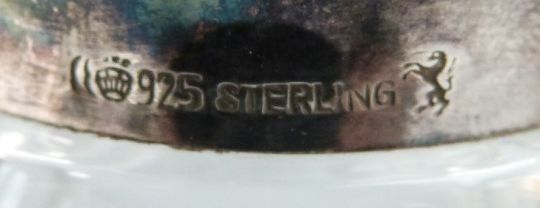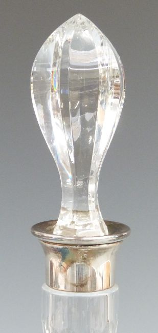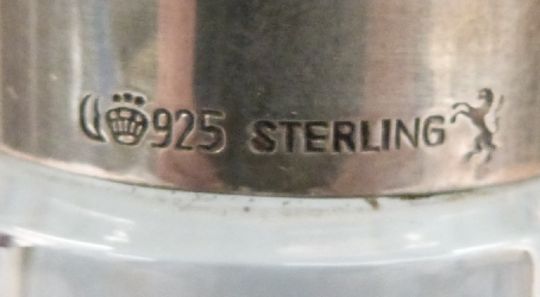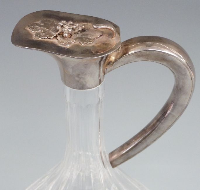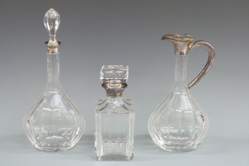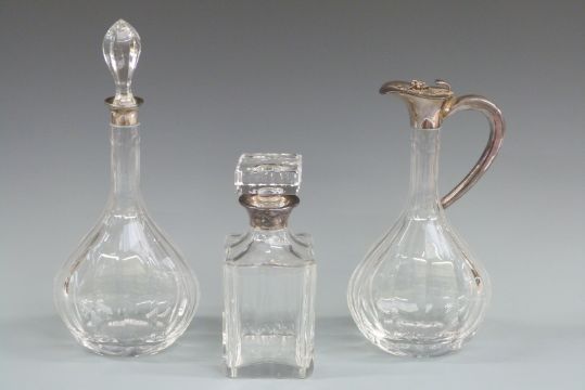 Silver mounted decanter set comprising claret jug and two decanters, the mounts on each marked sterling and with prancing horse, height of tallest 37cm