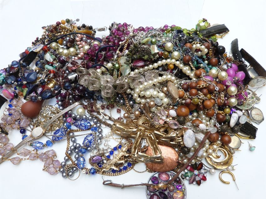 A collection of costume jewellery including 9ct gold chain, locket, watches, beads, Sarah Coventry ring, silver cat pendant, silver spoon etc