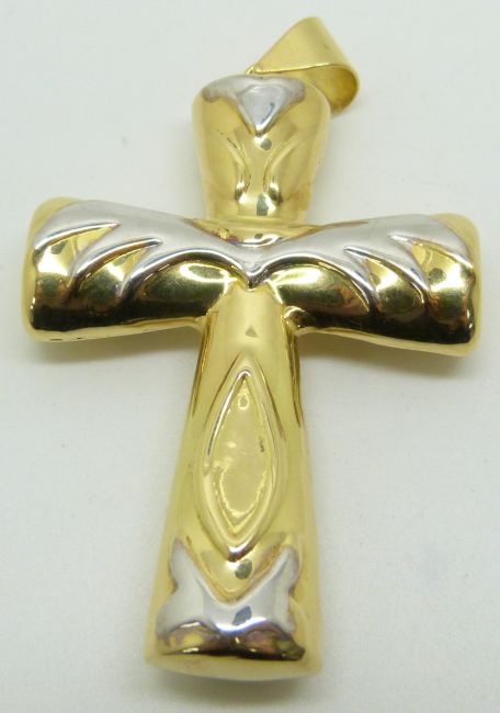 An 18ct gold bicoloured cross pendant with relief decoration, H7.4cm, 14.4g