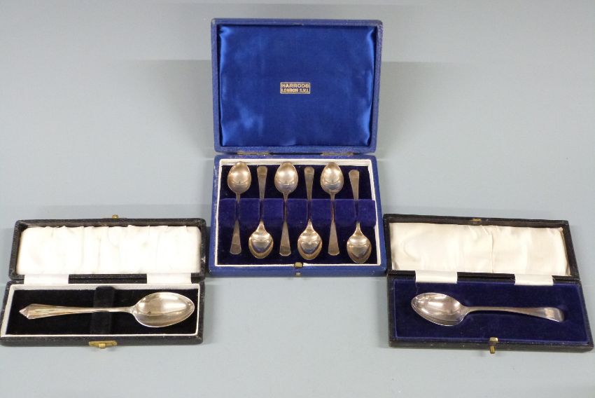 Two cased hallmarked silver teaspoons, cased set of six Harrods hallmarked silver teaspoons, cased hallmarked silver napkin ring and two loose octagonal examples, boxed hallmarked silver handled cake slice, silver topped glass sugar caster, novelty plated watering can cruet etc, weight of silver 165g