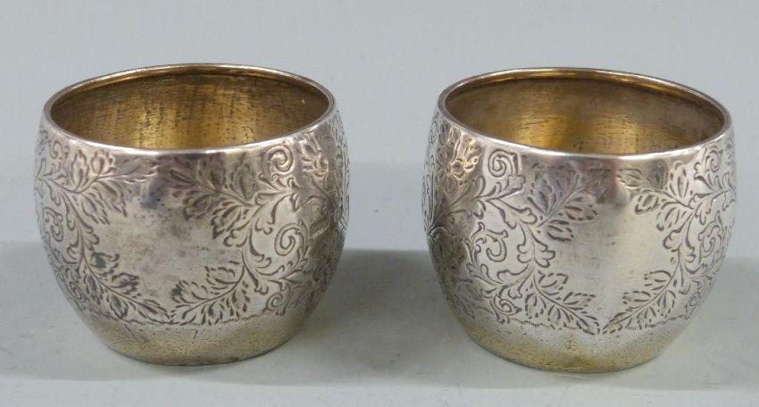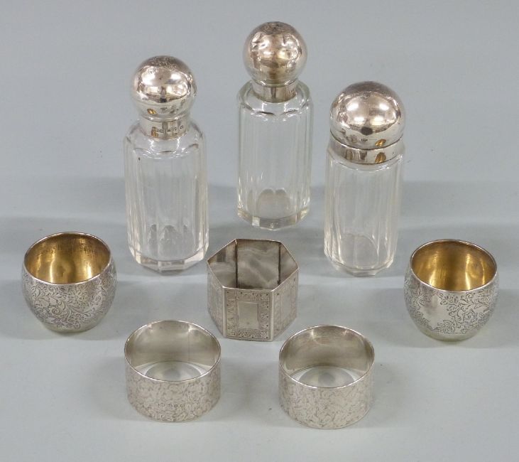 Pair of Elkington Victorian hallmarked silver open salts, London 1873, three Victorian hallmarked silver napkin rings and three hallmarked silver topped dressing table bottles, 188g weighable silver
