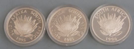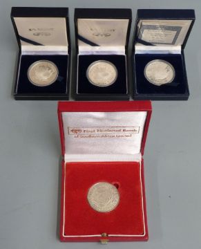 Four South African Mint silver 1 Rand Protea coins, 1990s commemoratives including Nursing Centenary example, all cased, one with certificate