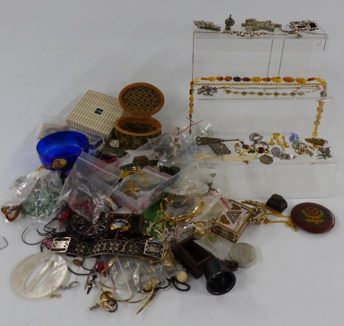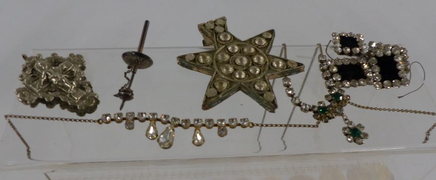 A collection of vintage jewellery including amber necklace, WBS silver brooch, paste necklaces, 9ct gold chain and cross pendant etc