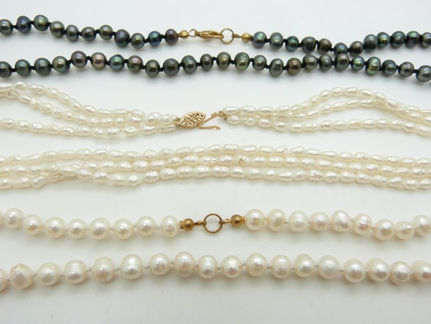 Three cultured pearl necklaces and a silver chain