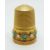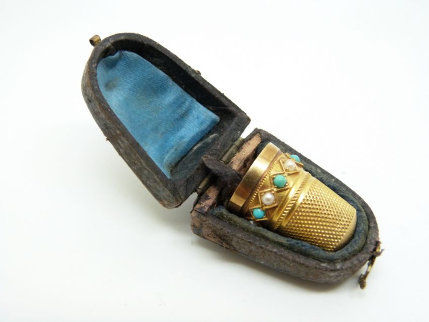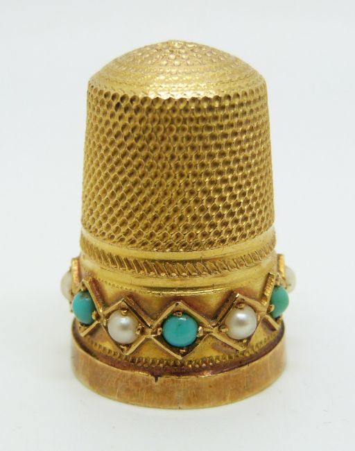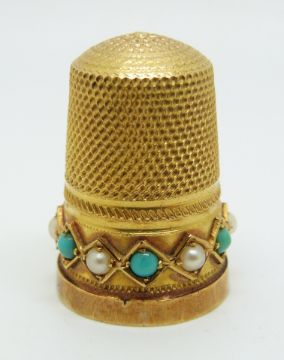 A yellow metal thimble set with pearls and turquoise in original box