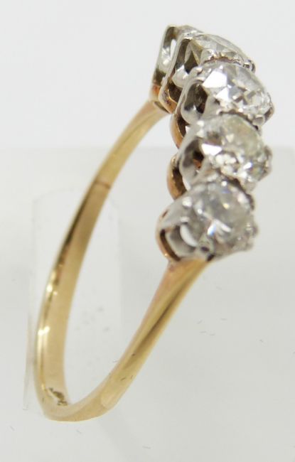 An 18ct gold ring set with five diamonds, the central diamond of approximately 0.33ct, 2.8g, size N/O