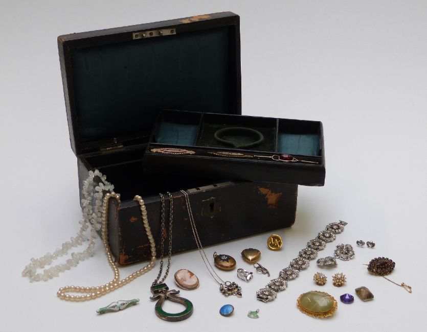 A collection of jewellery including two Victorian lockets, Austro Hungarian pendant, silver jewellery, Victorian brooches etc, in a tooled leather box