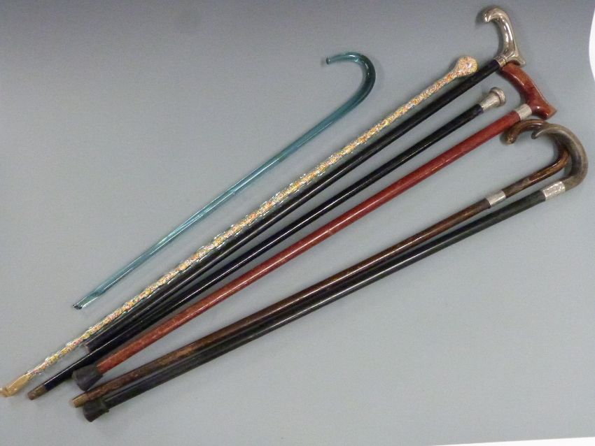 Four hallmarked silver mounted walking sticks and canes, two glass walking canes and one other