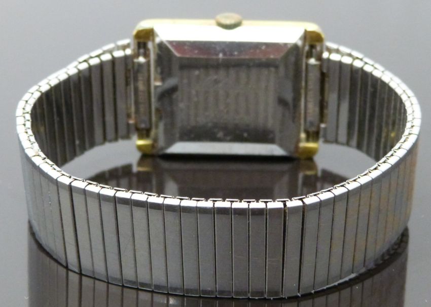 Omega De Ville automatic gentleman's automatic wristwatch ref. 161.013 with black and gold hands and baton markers, silver dial, rectangular gold plated case and 24 jewel calibre 671 movement, on expanding bracelet, case diameter 26mm, serial number 23384860, in Omega Constellation box.