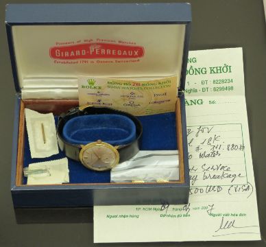 Girard Perregaux 18ct gold gentleman's wristwatch with inset subsidiary seconds dial, gold hands and baton markers, silver dial, textured case and signed 17 jewel movement, on black leather strap, case diameter 34mm, serial number 2529207, in original box with related paperwork and purchase receipt.