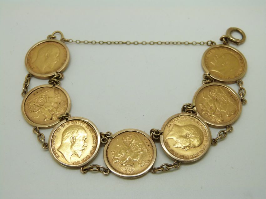 A 9ct gold bracelet set with seven half sovereigns, 1905, 1908, 1908, 1905, 1910, 1910, 1911, 38g