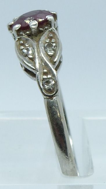 A platinum ring set with a round cut ruby of approximately 0.8ct and diamonds, 4.4g, size R