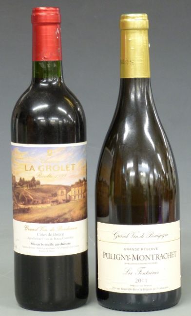 Two bottles of french wine. Les Fontaines grande reserve Puligny-Montrachet 2011 white wine, 750ml, 13% vol. Chateau La Grolet Recolte 1999 Cotes de Bourg red wine, 750ml, 12% vol.