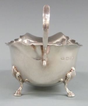 George V hallmarked silver sauce boat with shaped edge and raised on three pad feet, Chester 1930 maker Adie Bros Ltd, marked to underside John Bagshaw & Sons Liverpool, length 14.5cm, weight 88g