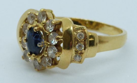 A 9ct gold ring set with a sapphire and diamonds and another yellow metal ring set with paste, size 9.1g