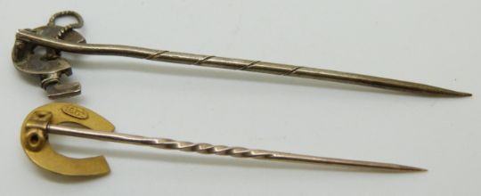 Victorian/Edwardian 15ct gold stick pin and a silver stick pin, both in the form of horseshoes