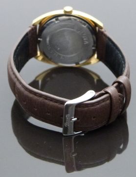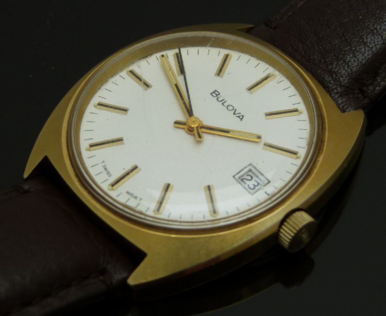 Bulova gentleman’s wristwatch ref. 7530-1 with date aperture, two-tone hands and baton markers, silver dial, gold plated case and signed 17 jewel calibre 11 AOCD movement, on brown leather strap, case diameter 36mm, serial number 3-907807.