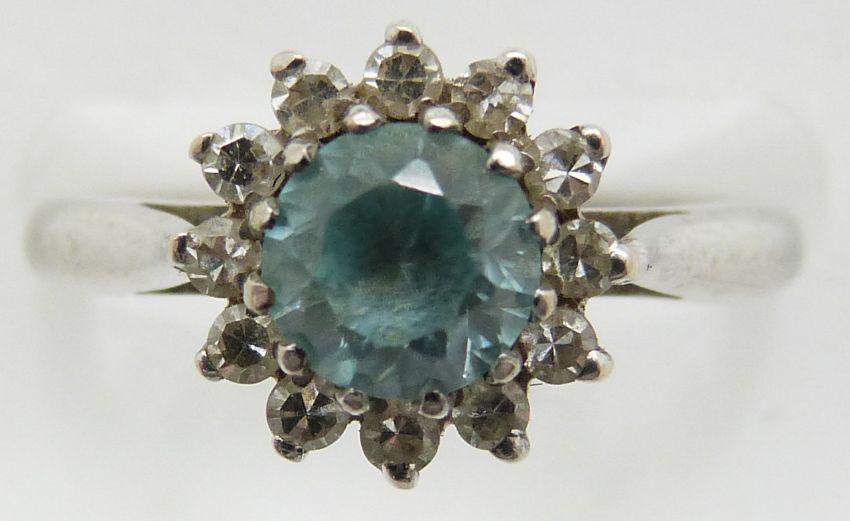 An 18ct white gold ring set with a round cut zircon and surrounded by diamonds, 3.9g, size J/K