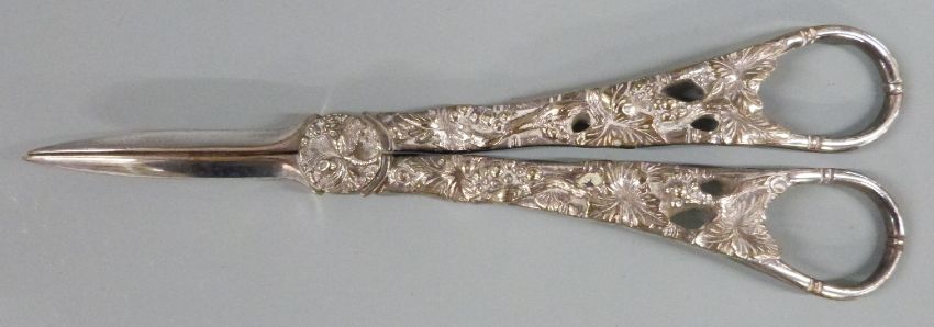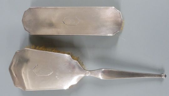 Two hallmarked silver mounted brushes, Viners Kings pattern silver handled carving set, cheese board on silver plated stand, sugar caster and a pair of grape scissors