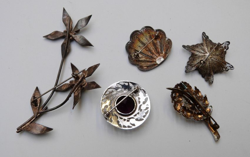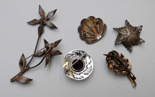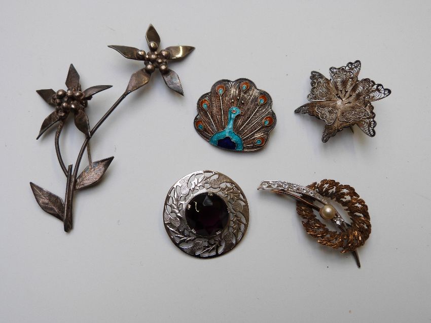 A silver thistle brooch, silver filigree items, crystal necklace, silver St Christopher, vintage necklaces etc