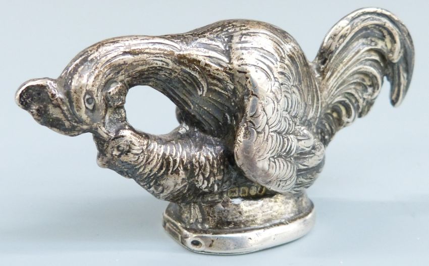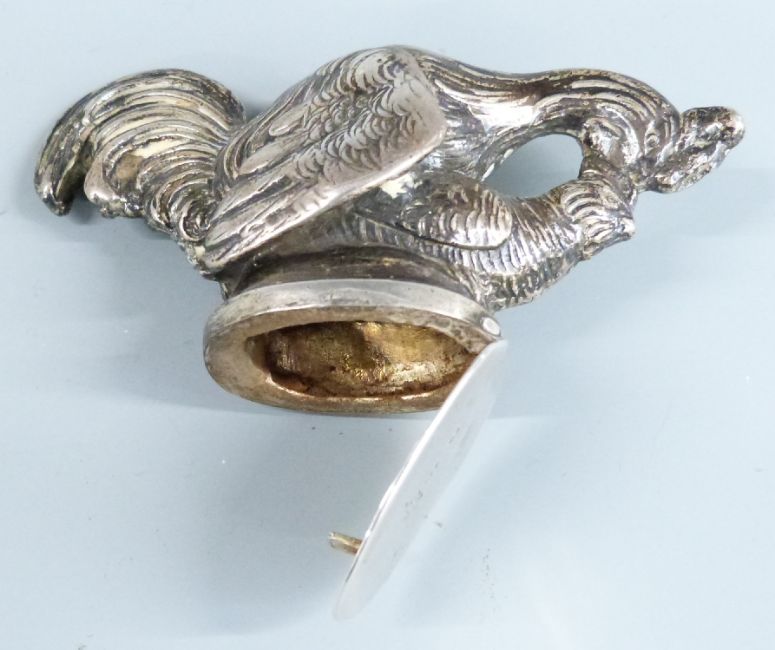 19th/early 20th century continental silver novelty snuff box modelled as a cockerel and hen mating, marked to lid 930 and with maker's mark SB, length 8.5cm, weight 70g